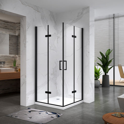 KAYLEE - Cabina doccia angolare con ante scorrevoli, vetro trasparente 6 mm e profilo nero opaco -